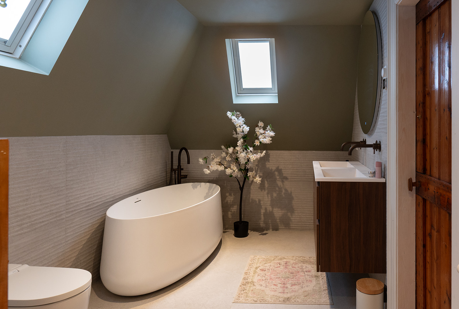 De basis van deze badkamer is een grote zandkleurige wandtegel met 3D reliëf. Het reliëf geeft tekening wat de wanden interessant maakt, zonder dat het druk wordt. Door de schuine kap is er tot schothoogte betegeld. Daarboven is gekozen voor strak, glad stucwerk. Dat maakt het geheel intiemer en zorgt voor een rustige afwerking, terwijl de tegel juist dat beetje extra karakter geeft.