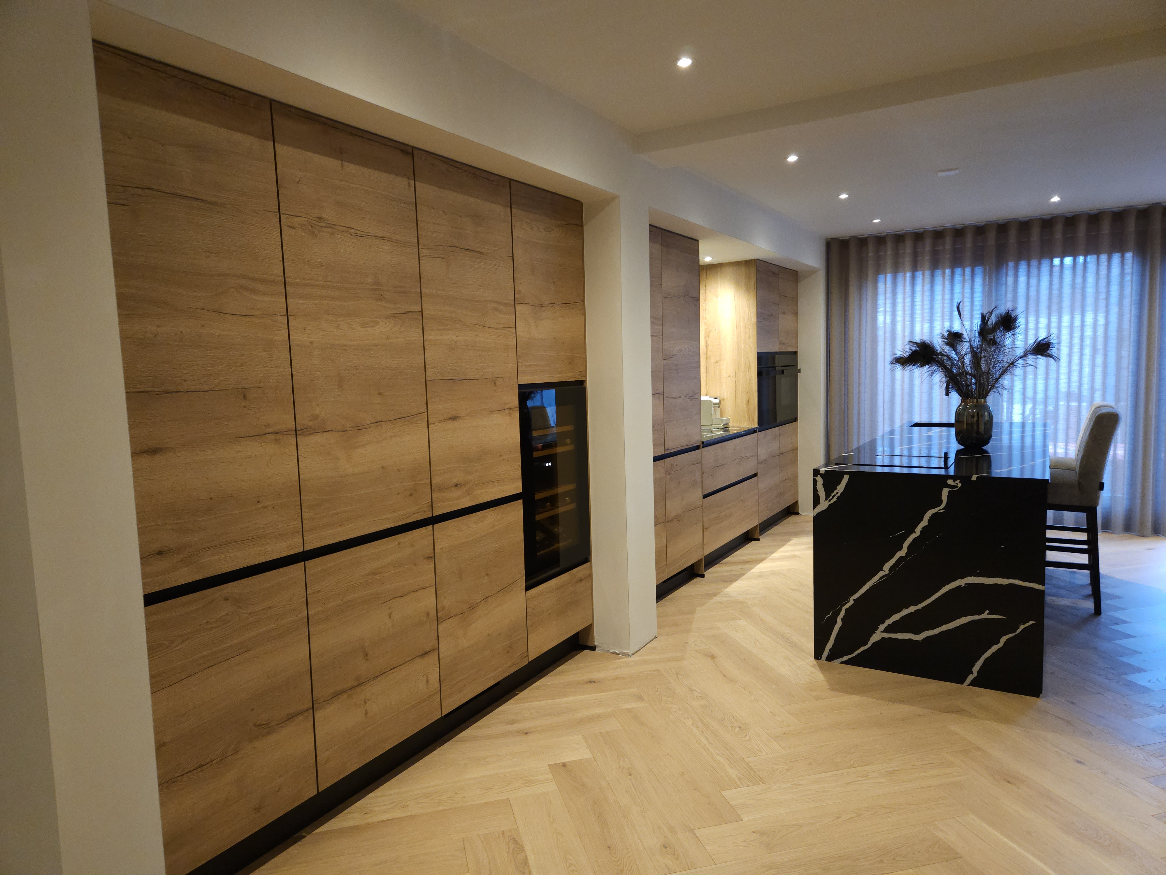 Het kookeiland in donker marmerlook met opvallende aders is de blikvanger. De hoge kastenwand is netjes in de muur verwerkt voor een ultrastrak frontbeeld. Achter die serene belijning zit verrassend veel bergruimte en een slimme indeling, waardoor het werkblad vrij en uitnodigend blijft. De geïntegreerde wijnkoeler in de kastenwand houdt je flessen op serveertemperatuur terwijl de fronten mooi rustig blijven.
