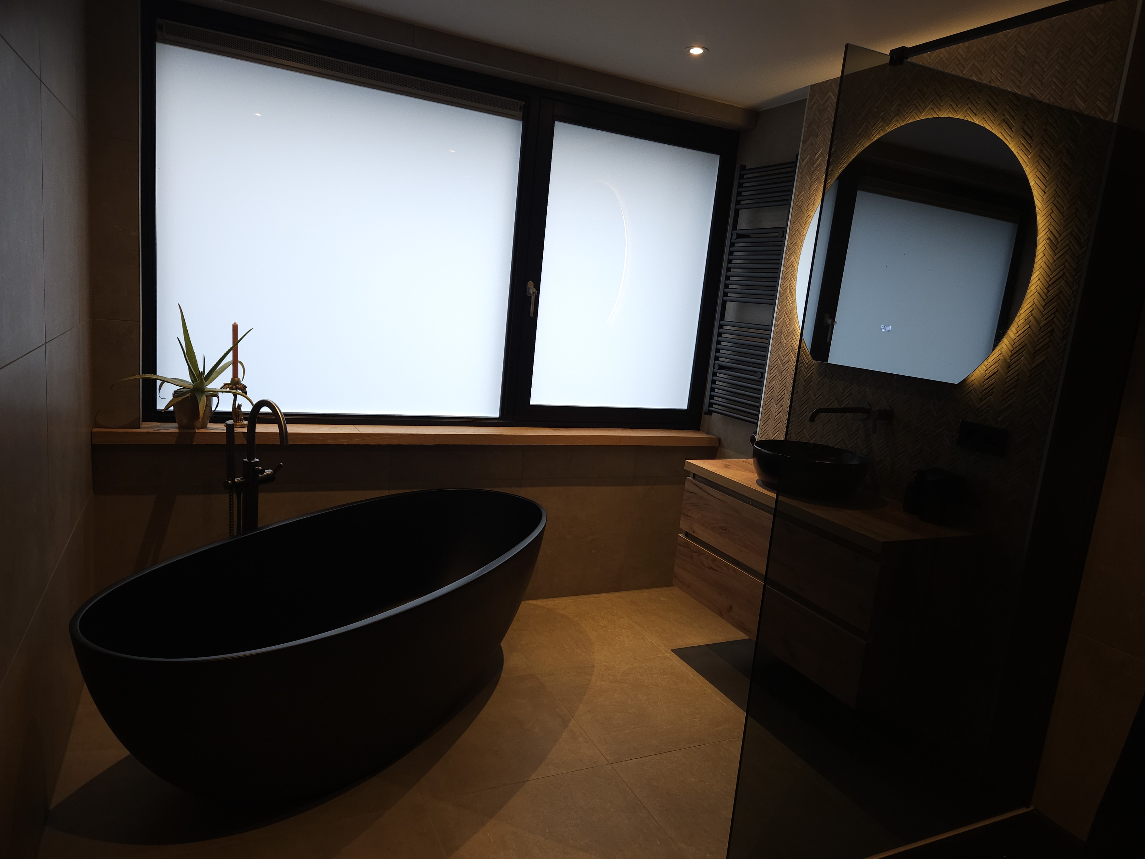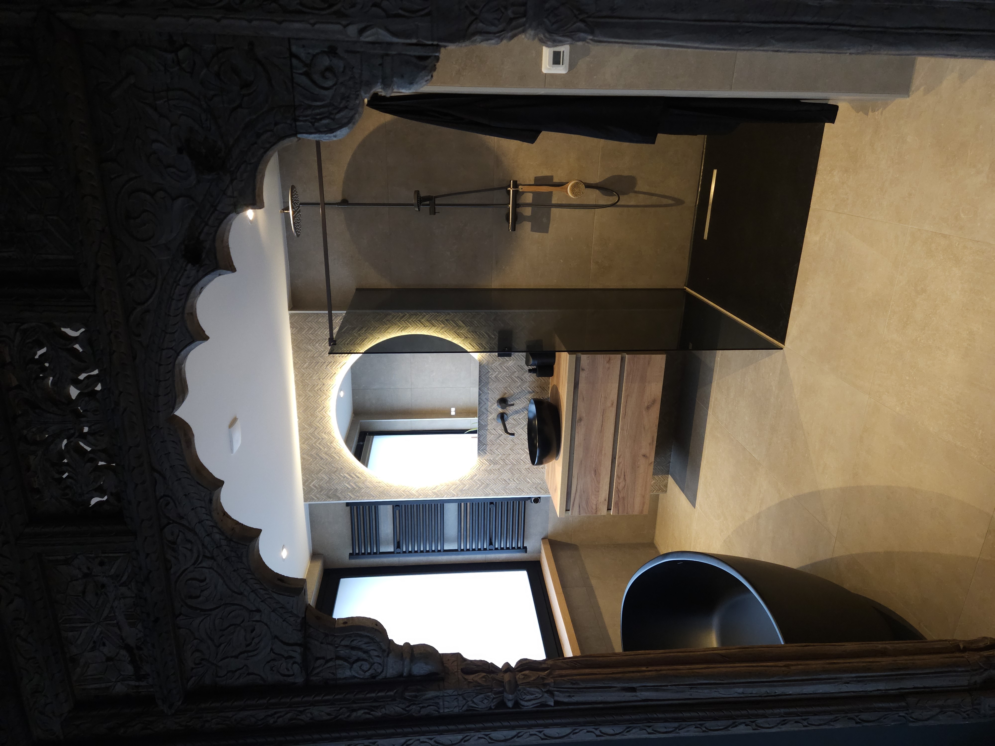 De grote vloertegels zorgen voor rust en ruimtelijkheid. Het meubel in warme houttint en de ronde spiegel met verlichting brengen sfeer. Het vrijstaande bad in mat zwart is favoriet in huis en wordt vaak gebruikt voor een ontspannend moment. De kranen en accessoires in gunmetal geven een stoer uitstraling. In het douchegedeelte ligt een zachte douchebak die prettig veert en warm aanvoelt. Robin verwoordde het zo: “Als je eenmaal zo’n zachte douchebak gewend bent, wil je niet anders meer.”