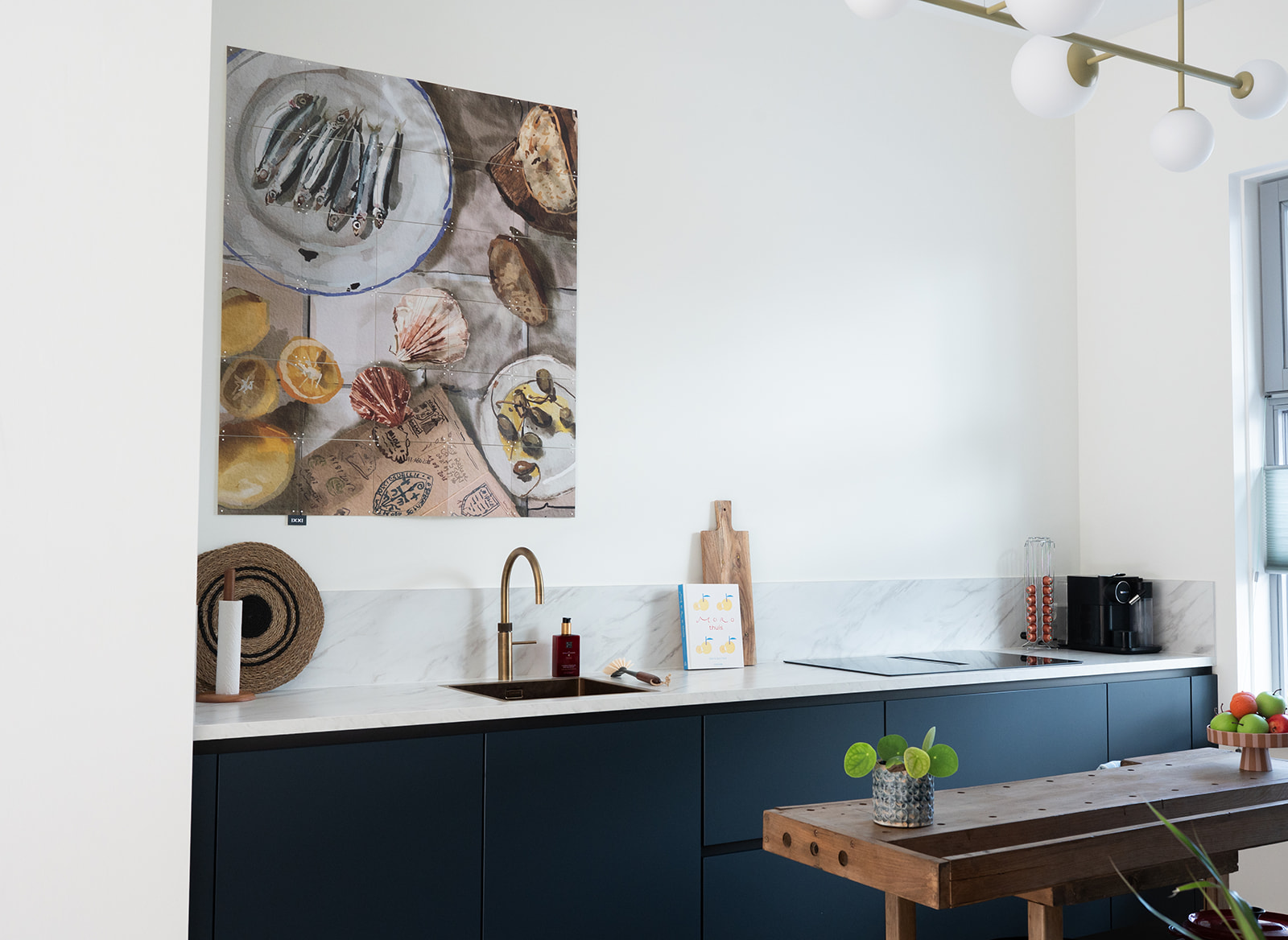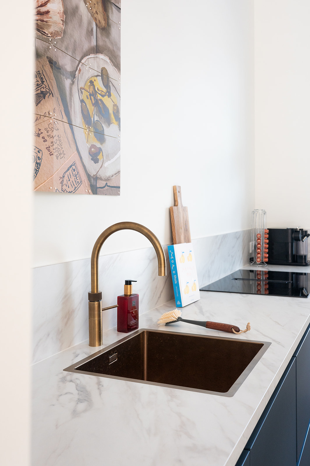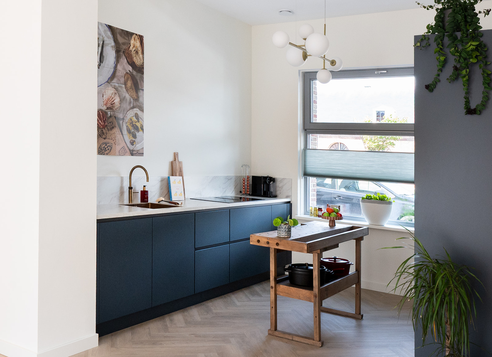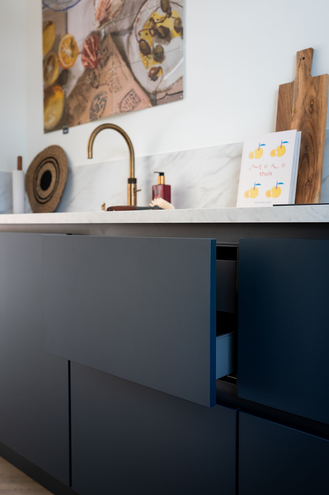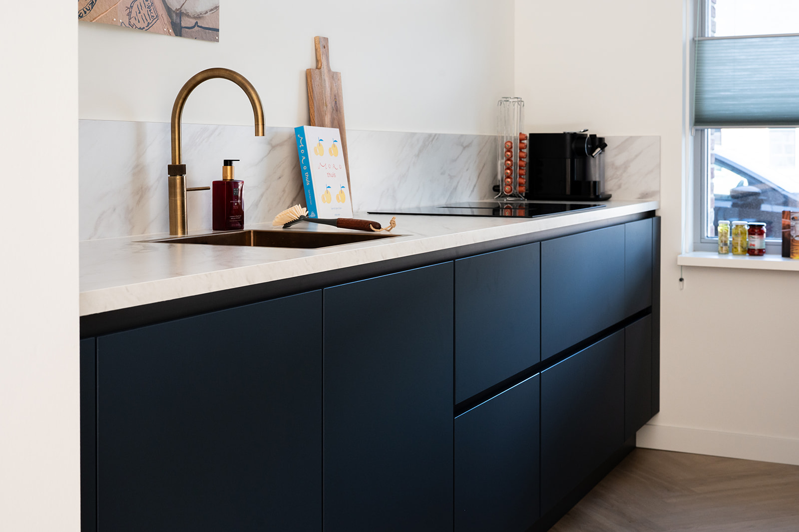 De keuken heeft matte diepblauwe fronten en een warm geaderd marmerlook werkblad met achterwand. De aders sluiten mooi aan op de frontkleur voor extra rust. De goudkleurige kraan en spoelbak geven een warme glans en verbinden de keuken met de messing details elders in huis. De hoge kastenwand bundelt apparatuur op hoogte en zorgt voor royale opbergruimte. Dankzij het lange werkblad en het daglicht bij het raam is dit een fijne leefkeuken voor elke dag.