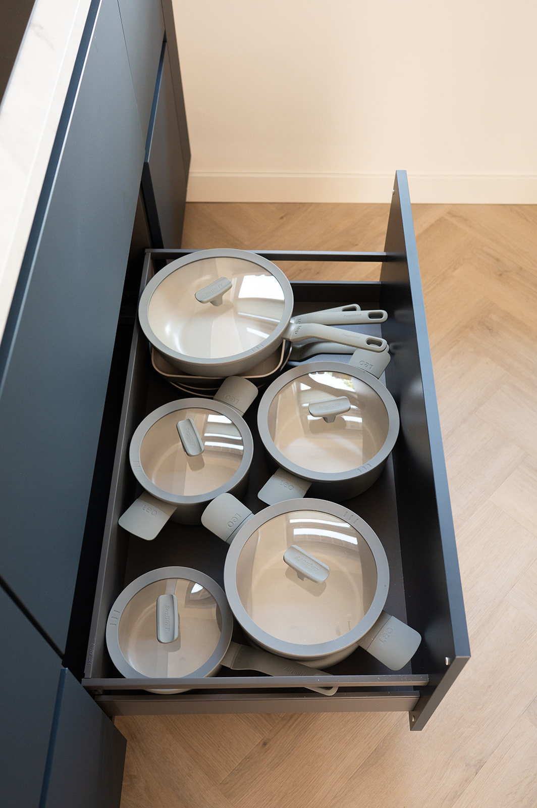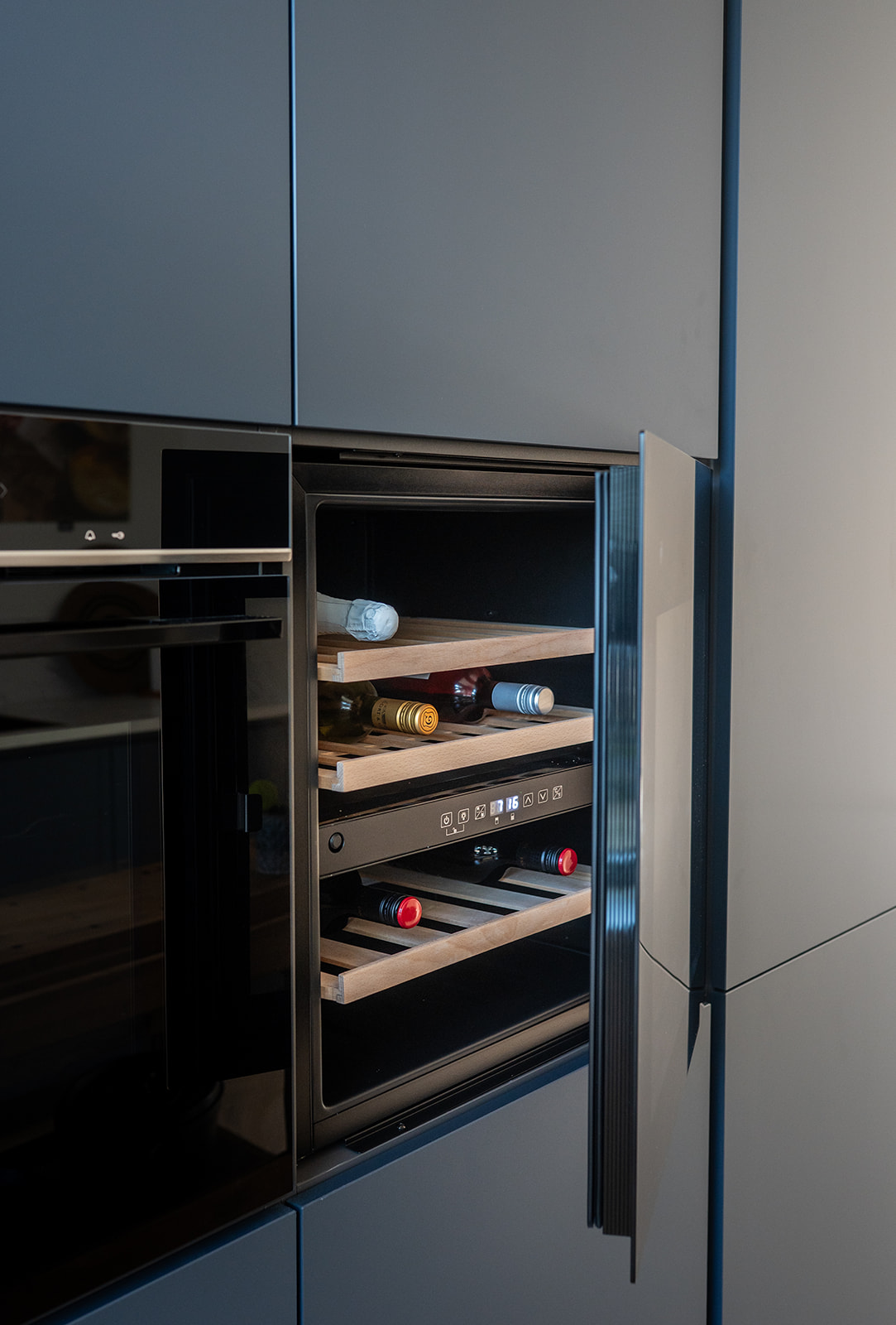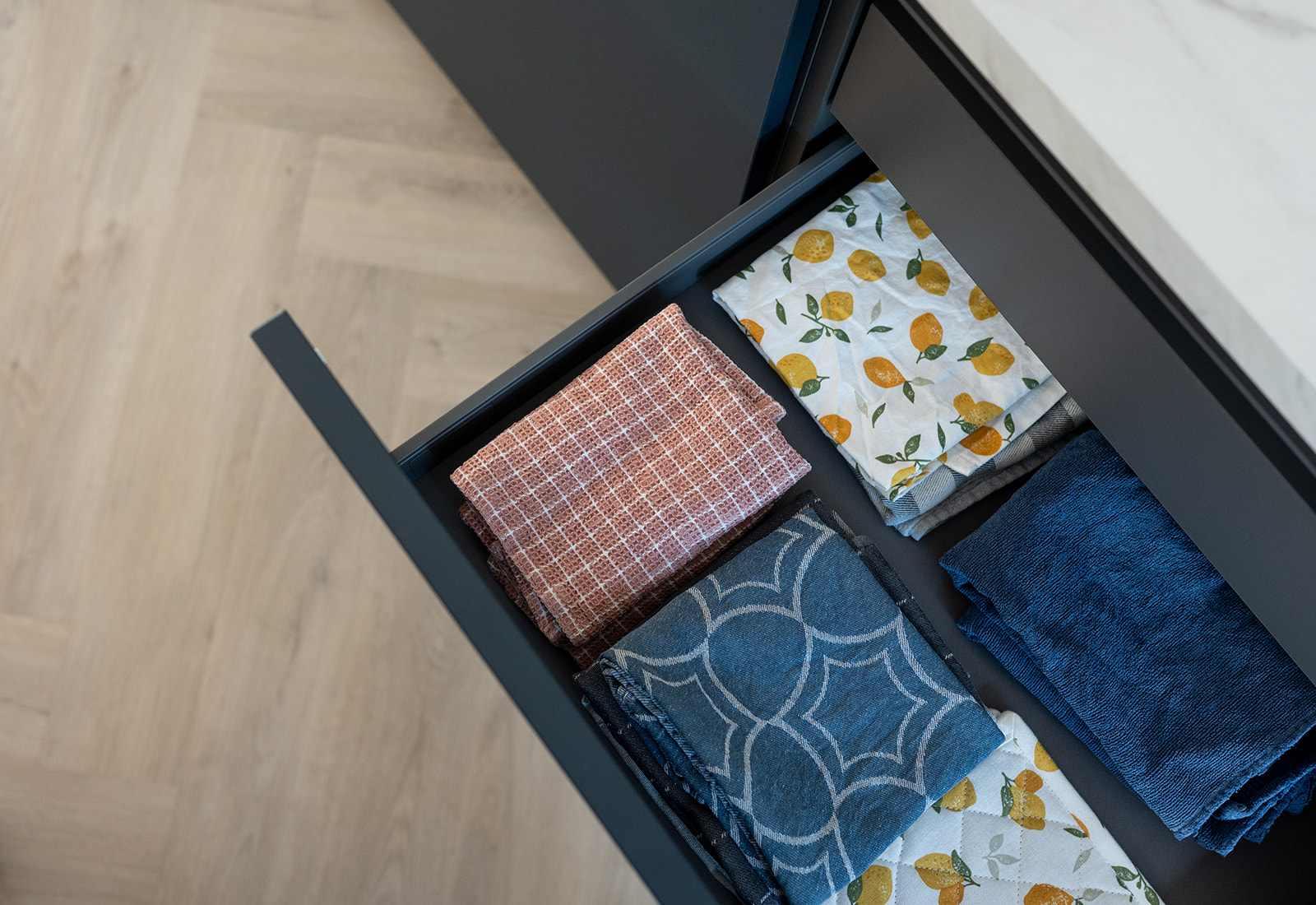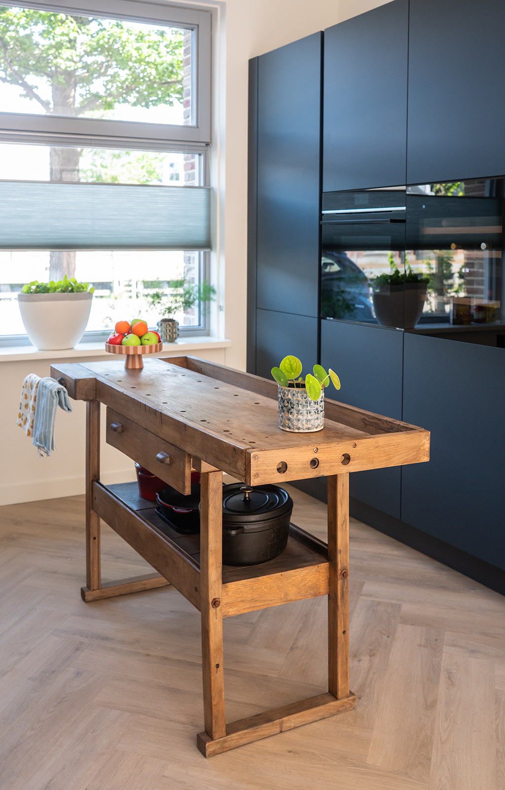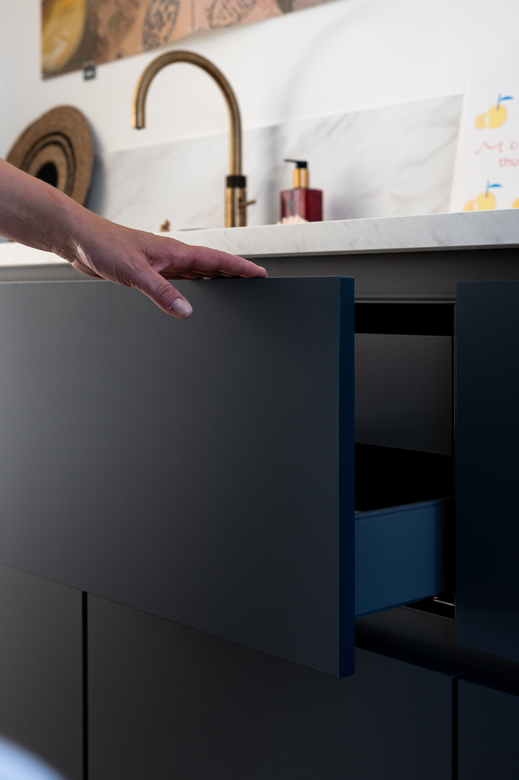 De keuken heeft matte diepblauwe fronten en een warm geaderd marmerlook werkblad met achterwand. De aders sluiten mooi aan op de frontkleur voor extra rust. De goudkleurige kraan en spoelbak geven een warme glans en verbinden de keuken met de messing details elders in huis. De hoge kastenwand bundelt apparatuur op hoogte en zorgt voor royale opbergruimte. Dankzij het lange werkblad en het daglicht bij het raam is dit een fijne leefkeuken voor elke dag.
