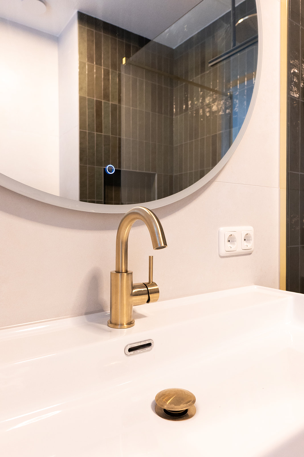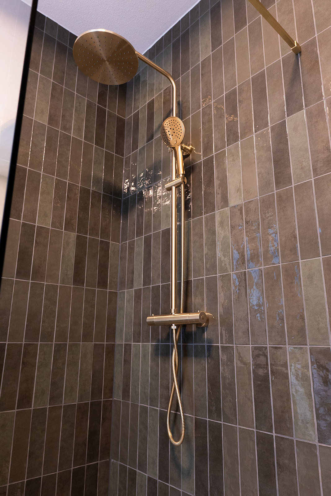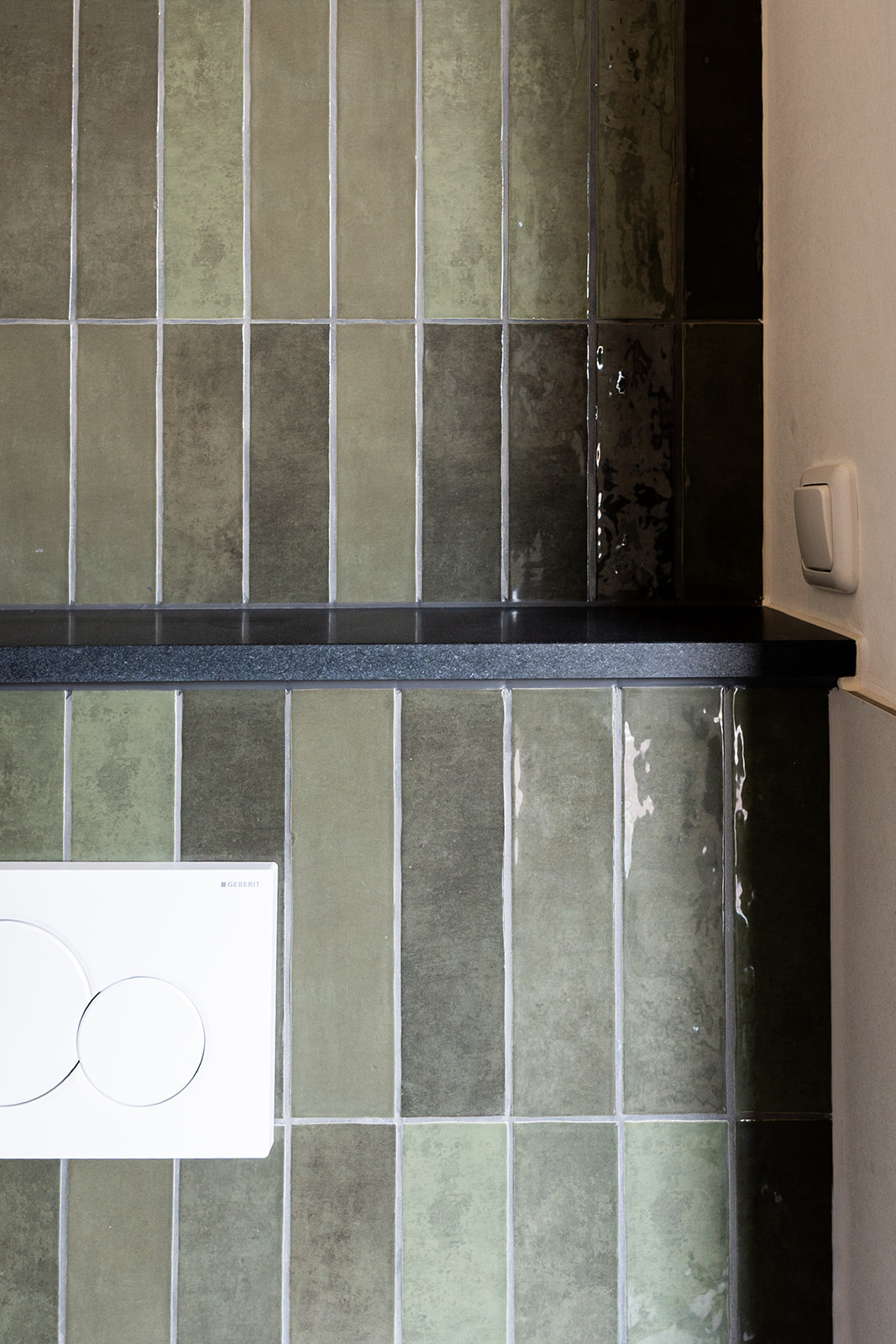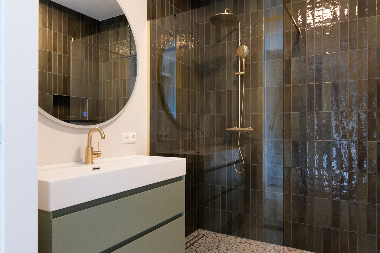 In de badkamer kozen we voor verticale donkergroene wandtegels met lichte glans. Door de staande plaatsing oogt de ruimte hoger en rustiger. De terrazzo vloer voegt karakter toe en combineert prachtig met de messing doucheset en kranen. Het saliegroene wastafelmeubel met brede lades biedt veel opbergruimte en de ronde spiegel met verlichting maakt het dagelijks gebruik comfortabel.