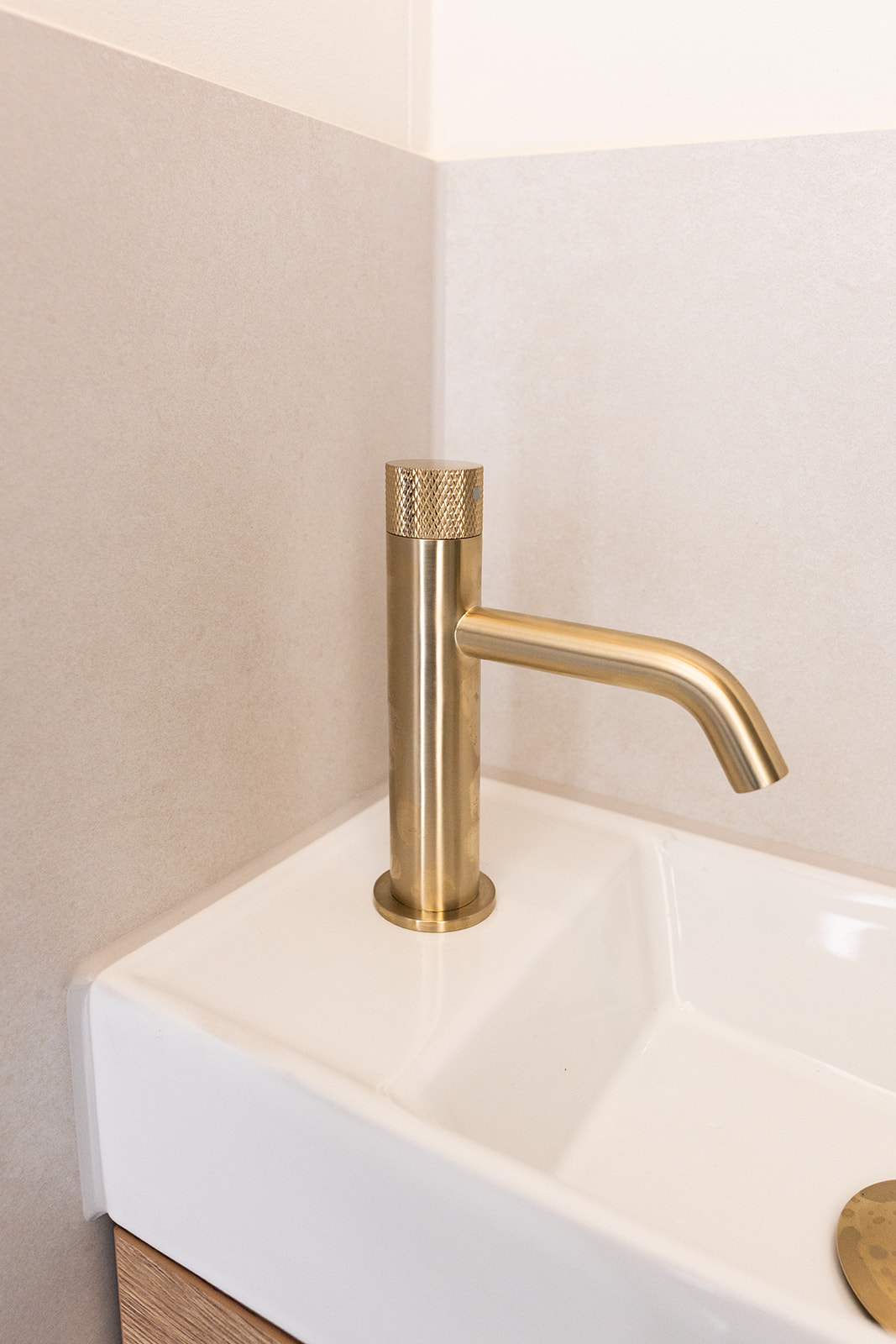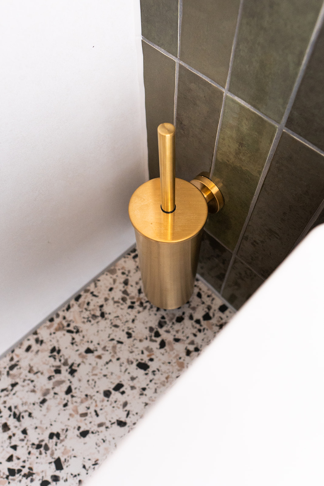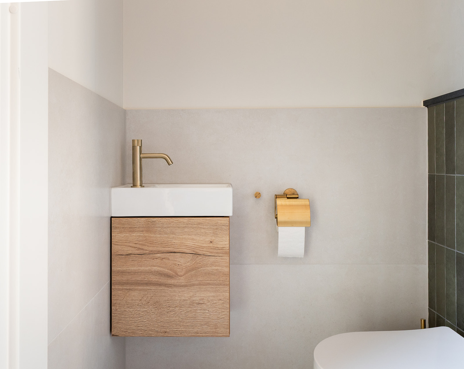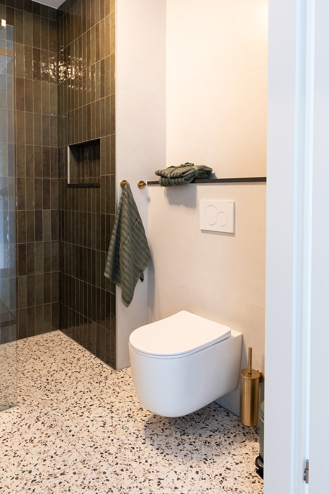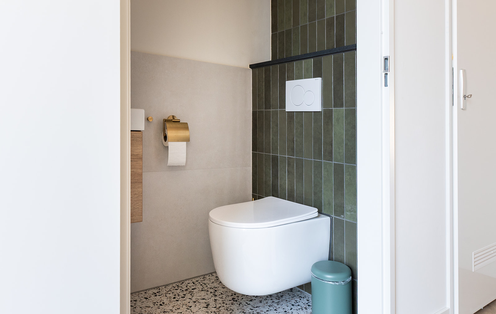 Het toilet volgt dezelfde signatuur als de badkamer. De groene tegelwand en terrazzo vloer lopen door en de goudkleurige accessoires zorgen voor warmte. Een compact fonteinkastje in hout brengt een natuurlijk accent en maakt het geheel praktisch in gebruik.